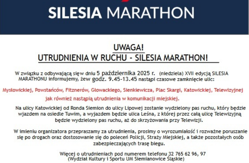 W związku z planowanym biegiem w najbliższą niedzielę, prosimy o zapoznanie się z informacjami UM Siemianowice Śl. na ten temat.